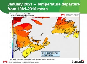 See all the details in the attached final report for January and an outlook for February 2021 from Jill Maepea, Warning Preparedness Meteorologist / Client Service Operations Atlantic, Environment and Climate Change Canada / Government of Canada.