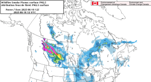 Click here for Environment and Climate Change Canada (ECCC) smoke predictions for next 72 hours (Click the "play" button for animation). Additional maps and modelling can be found at the Air Quality Model Forecast page.